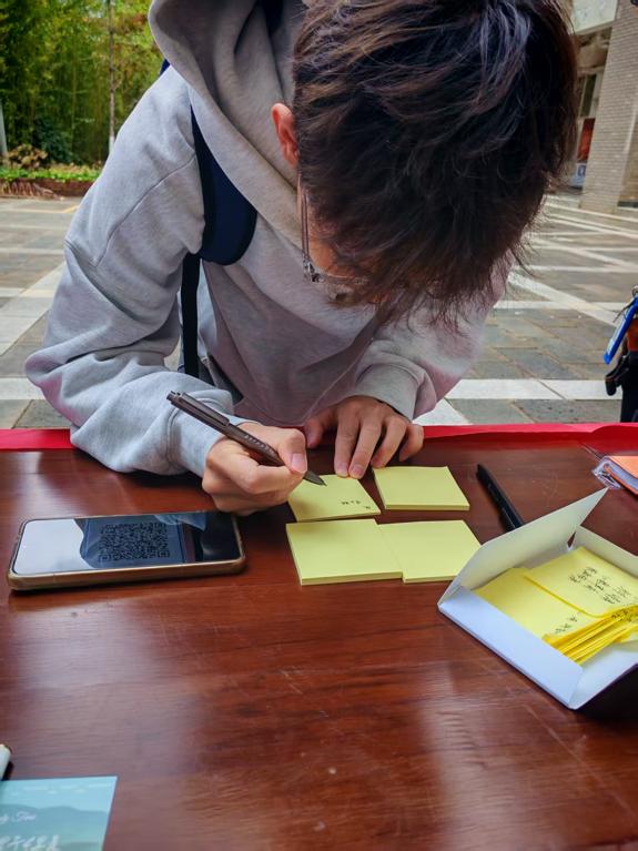 活动现场,氛围温暖而热烈,同学们踊跃参与,纷纷将手中闲置的课外书籍送至捐赠点,有序完成签到流程。不少同学还在明信片上写下暖心寄语,为社区居民送上阅读祝福与精神关怀,每一份寄语都承载着昆工学子的赤诚爱心。为感谢同学们的公益善举,写下寄语的捐赠者额外获得定制的一份纪念品,进一步激发了大家的参与热情。